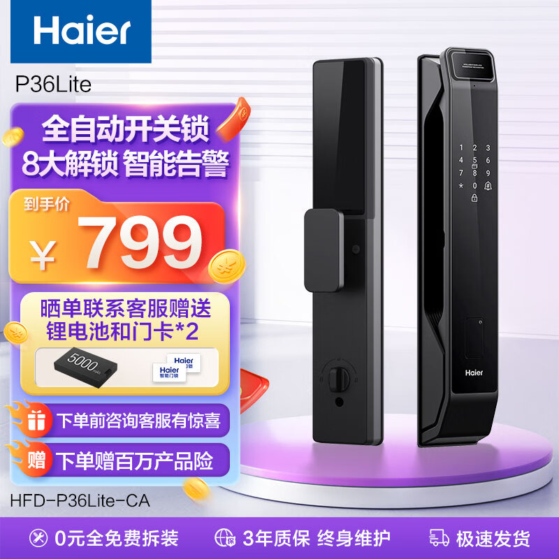 海尔(Haier) 智能门锁 P36Lite 指纹锁 全自动防盗门锁 智能锁 密码锁 入户门电子门锁 手机智控 全自动门锁【标准锁体】价格:699.00元!