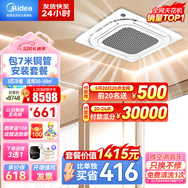 美的(Midea)3匹天花机空调吸顶吊顶空调 商用中央空调嵌入式变频冷暖220V包7米铜管安装RFD-72QW/BDN8Y-D(B3)价格:8748.00元!