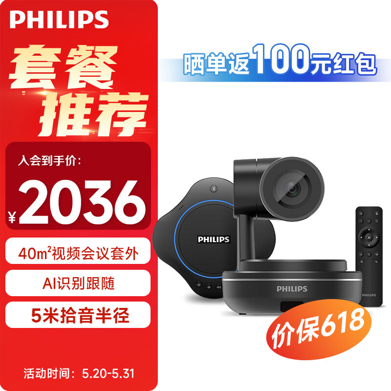 飞利浦视频会议套装/适用40㎡会议室/5米拾音半径全向麦克风0500+2K高清视频会议电脑摄像头0560价格:2036.00元!