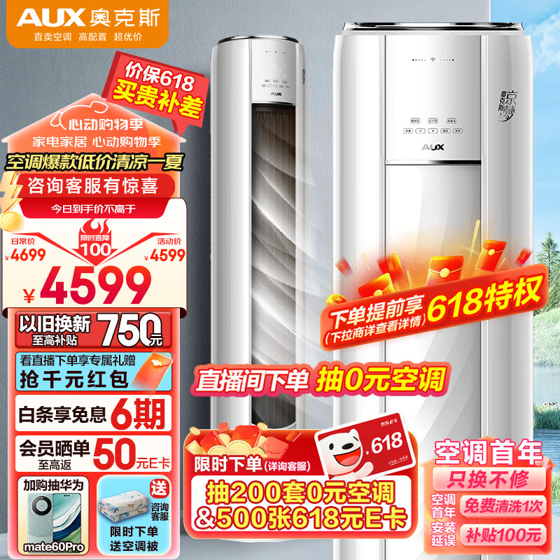 奥克斯(AUX)3匹 京梦 新3级能效 快速冷暖 一键超远风 立柜式空调柜机(KFR-72LW/BpR3AQE1(B3))WiFi智控价格:4599.00元!