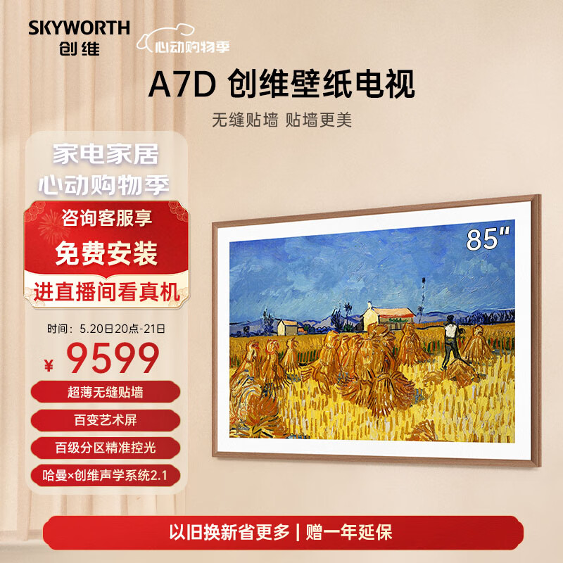 创维壁纸电视85A7D 85英寸超薄壁画艺术电视机80-100英寸无缝贴墙百变艺术屏4K超高清护眼超薄巨幕大屏价格:9999.00元!