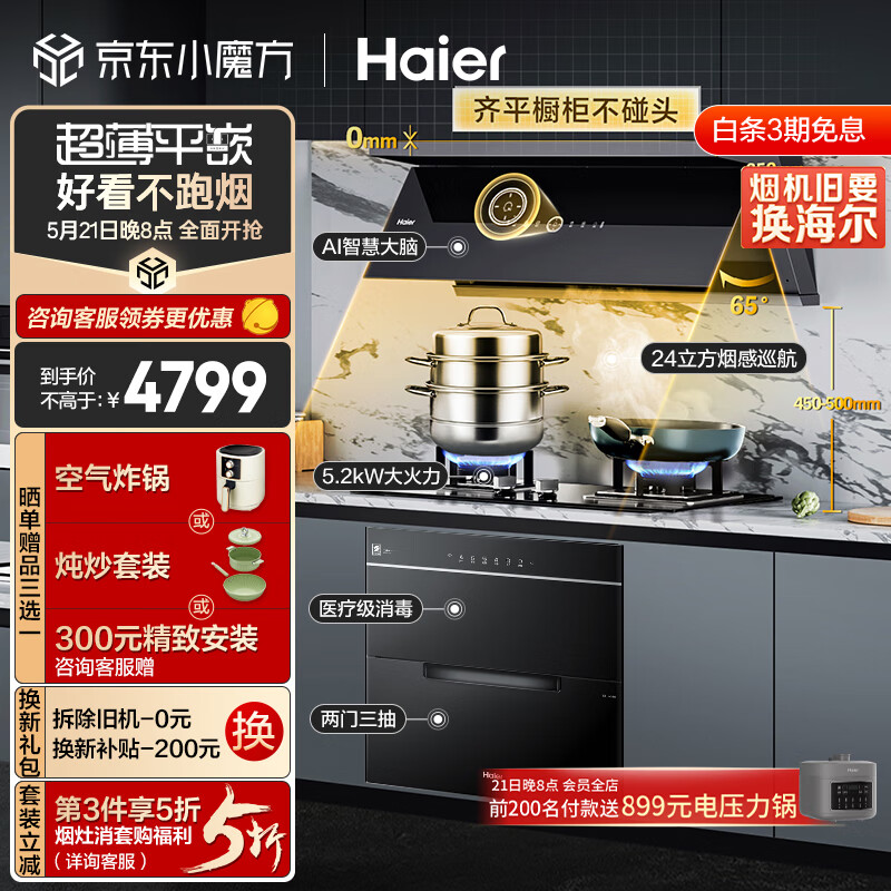 海尔(Haier)抽油烟机 超薄近吸 烟灶消三件套 24m3/min有效风 5.2KW大火力 医疗级消毒C30+Q2BE3天+E07JU1价格:4799.00元!