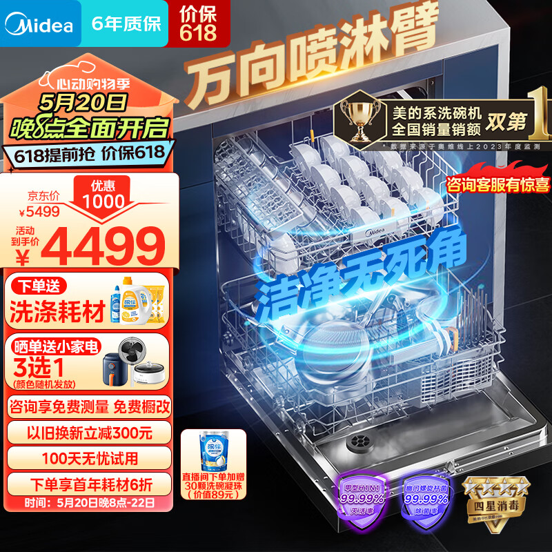 美的(Midea)万向2000洗碗机嵌入式14套大容量105℃热风烘干四星消毒一级水效168h存储变频万向星河黑色价格:8999.00元!