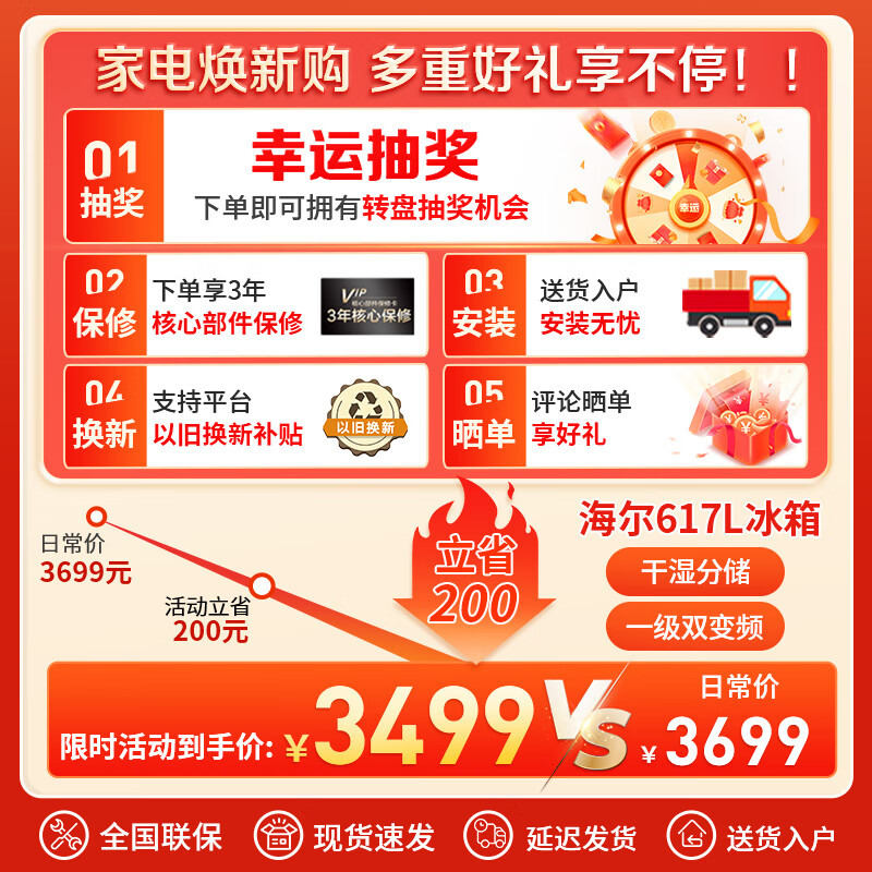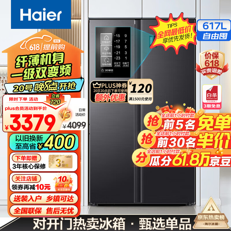海尔(Haier)617升冰箱双开门对开门纤薄一级能效双变频风冷无霜阻氧干湿分储大容量家用 黑金净化+90°开门悬停价格:4099.00元!
