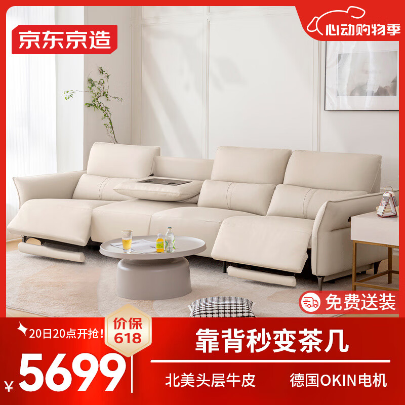京东京造真皮沙发 靠背秒变茶几|头层牛皮|现代轻奢双电动 米色四人位SE12价格:6199.00元!