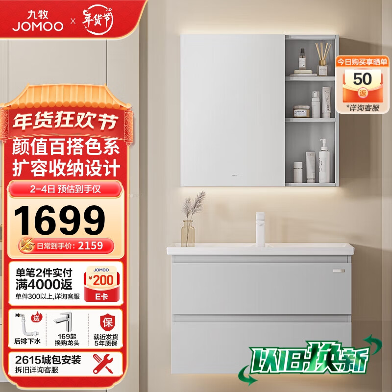 九牧(JOMOO)浴室柜 陶瓷一体盆抗菌洗脸盆柜组合双抽冷灰80cm A2721-15LD-2价格:2149.00元!