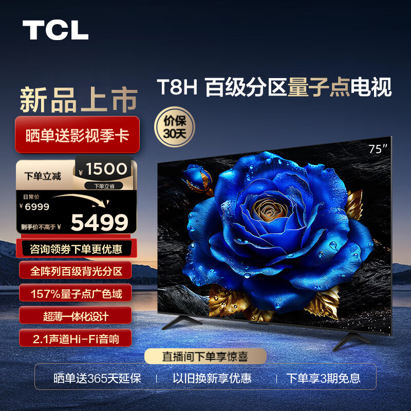 TCL电视 75T8H 75英寸 百级分区 QLED量子点 超薄 2.1声道音响 120Hz 4K 平板电视机 以旧换新 75英寸 官方标配价格:6999.00元!