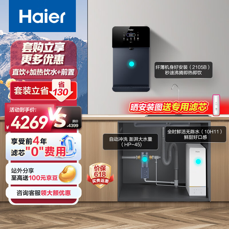 海尔(Haier)鲜活水净水器家用净水机1000G厨下式RO反渗透母婴直饮净水器+前置过滤器+管线机10H11+HP45+D2105B价格:4269.00元!
