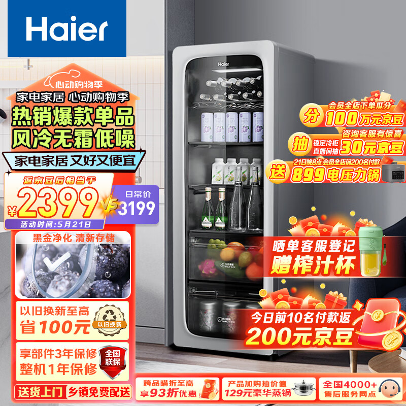 海尔(Haier)150升家用客厅办公室冷藏柜暖藏冰吧能量吧茶叶饮料水果蔬菜保鲜柜冰河银LC-150WLH9ES1以旧换新价格:2799.00元!