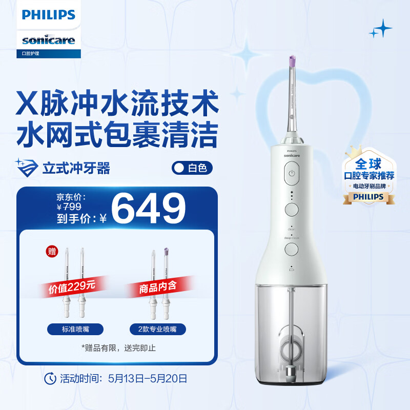 飞利浦家用立式冲牙器 男/女立式手持2种洁齿模式3级洁齿力度美牙舱 HX3826/31白色价格:649.00元!