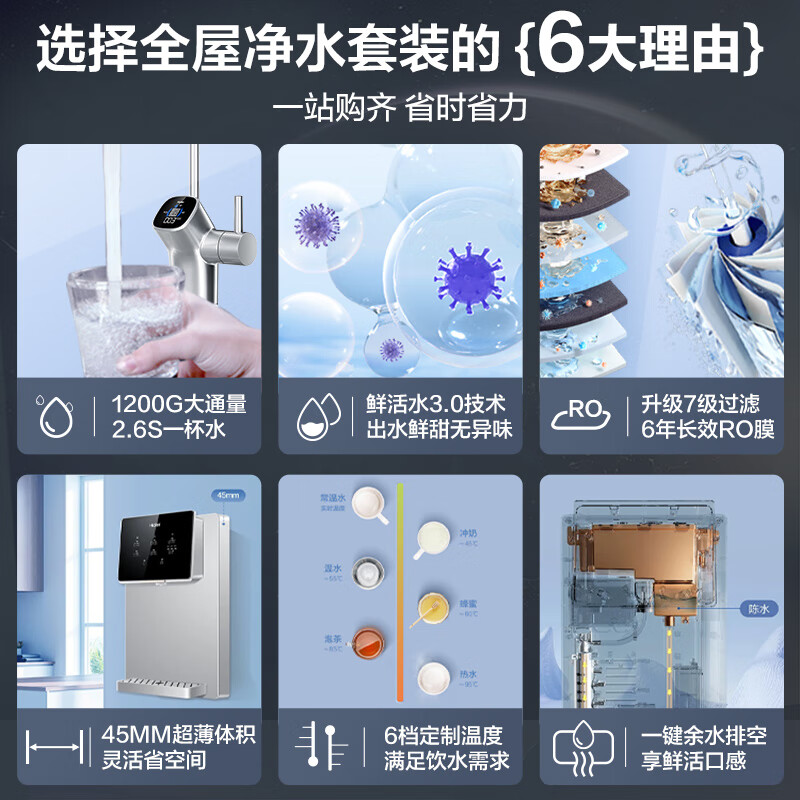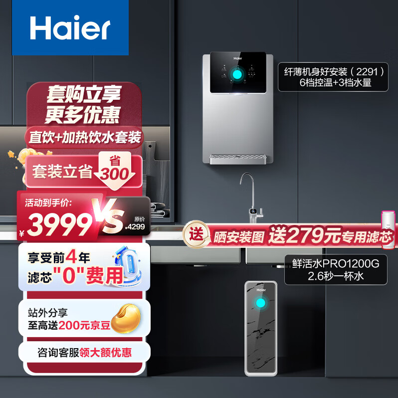 海尔(Haier)净水器1200G鲜活水pro 6年RO反渗透过滤器厨下直饮净水器+管线机HKC3000-R793D2U1+R2291价格:3999.00元!
