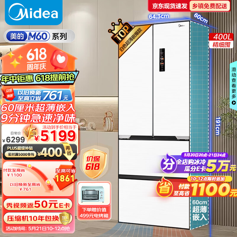 美的(Midea)M60隐形嵌421法式多门四开门超薄零嵌入平嵌一级变频除菌净味大容量家用电冰箱MR-421WUFPZE大白豚价格:6299.00元!