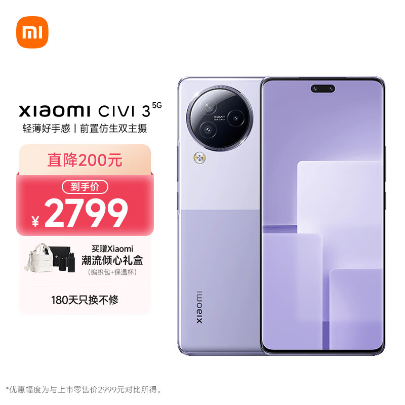 小米 Civi 3 前置仿生双主摄 光学防抖镜头 16GB+1TB 玫瑰紫 5g手机 澎湃OS SU7 汽车互联 AI手机价格:2799.00元!