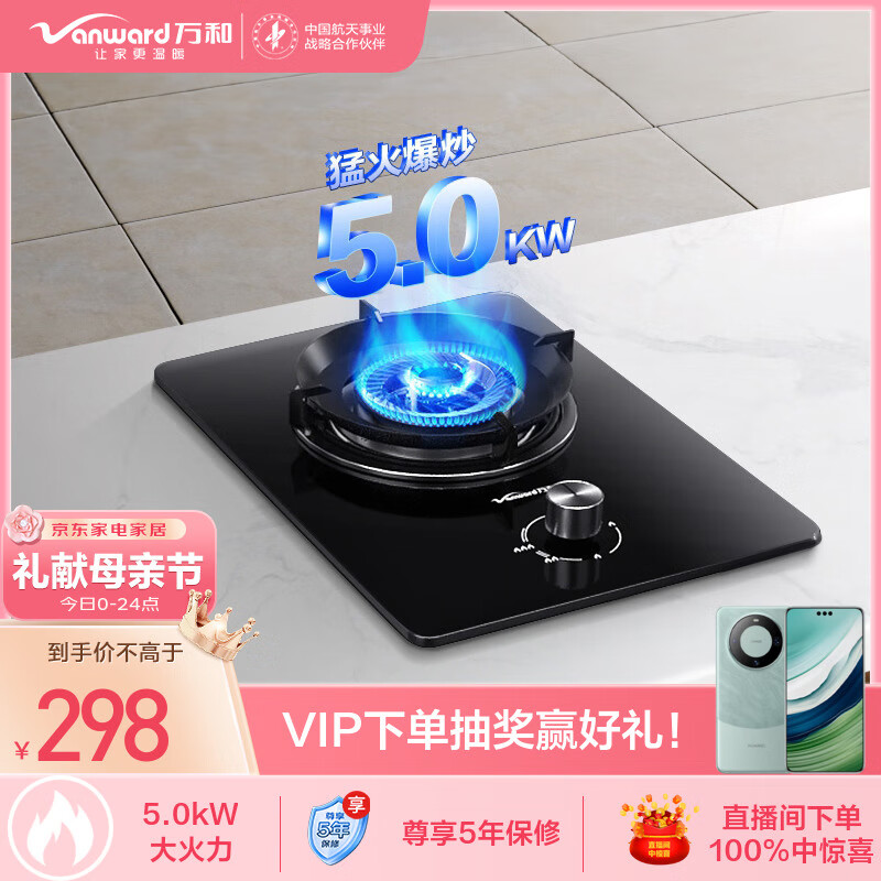 万和 Vanward 钢化玻璃燃气灶单灶具 单眼灶嵌入式 5.0kW大火力 台嵌两用 JZT-E6L90 天然气价格:298.00元!