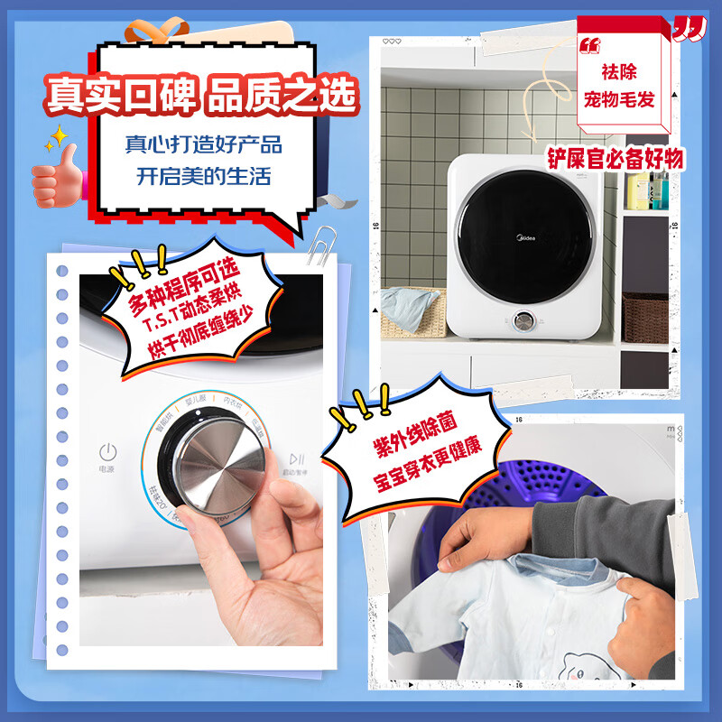 美的(Midea) 4公斤烘干机家用滚筒式干衣机小型烘衣机 衣物即烘即穿免安装 低温护衣 紫外线除菌 MH40V10E价格:899.00元!