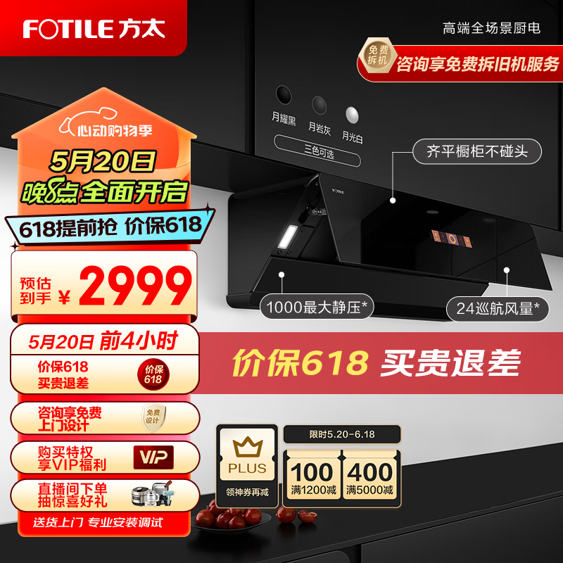 方太(FOTILE)抽吸油烟机 侧吸式家用厨房油烟机 24巡航风量 挥手智控 方太新月系列 月耀黑 01-F1A价格:3299.00元!