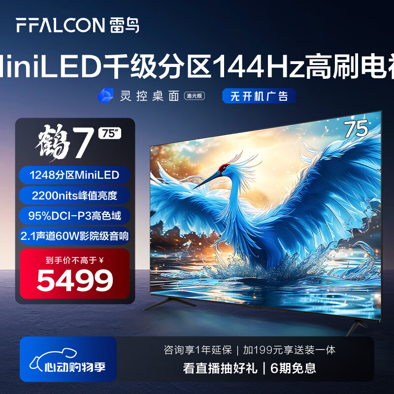 FFALCON雷鸟 鹤7 24款 75英寸 Mini LED 2200nits 1248分区 144Hz高刷 智能液晶平板电视机75R685C价格:6499.00元!