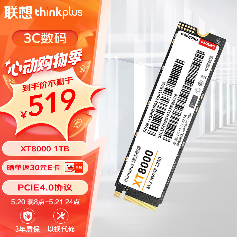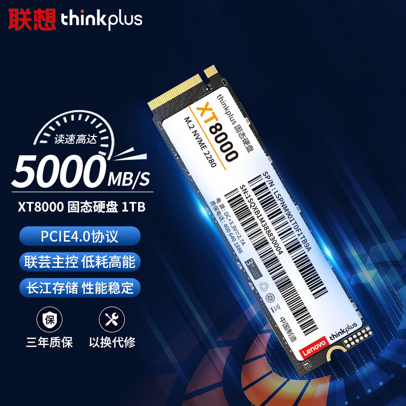 ThinkPlus联想 1TB SSD固态硬盘m.2接口(NVMe协议)pcie4.0 XT8000系列 读速高达5000MB/s价格:519.00元!