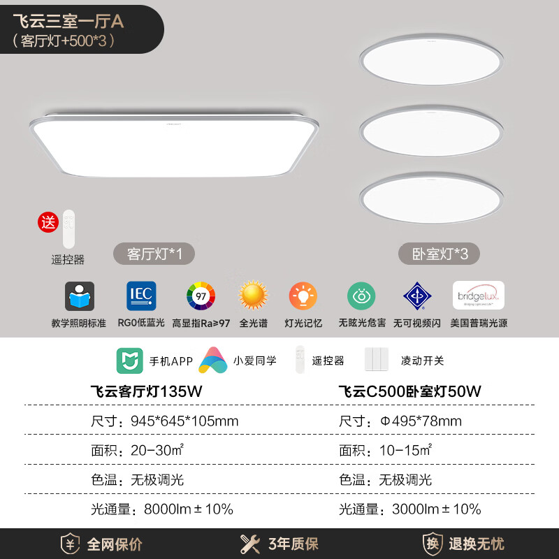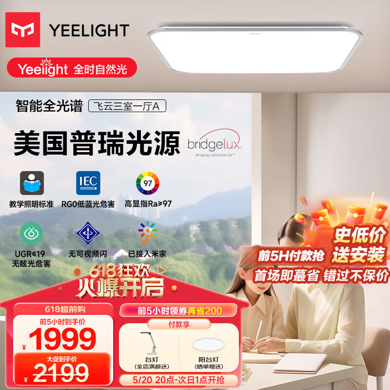 Yeelight易来led普瑞芯片护眼吸顶灯全光谱超薄灯具卧室餐厅灯智能3室1厅价格:2599.00元!