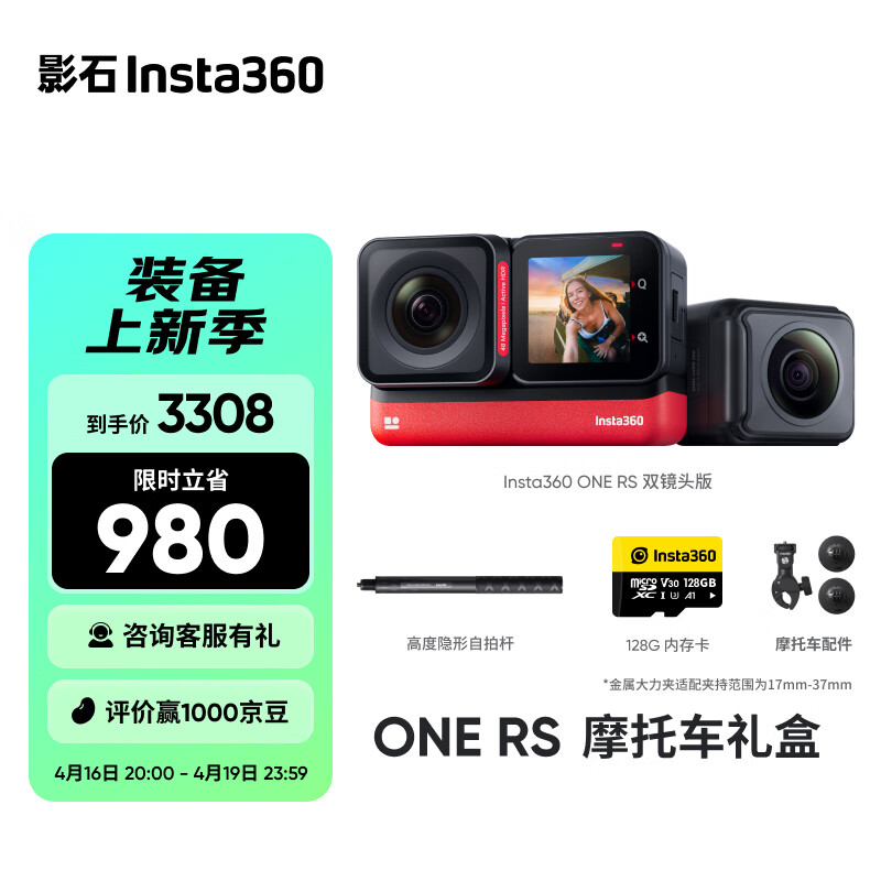 Insta360影石 ONE RS模块化运动相机全景相机防抖4K高清Vlog摩托车骑行滑雪(双镜头版 新版摩托车套装)价格:3308.00元!