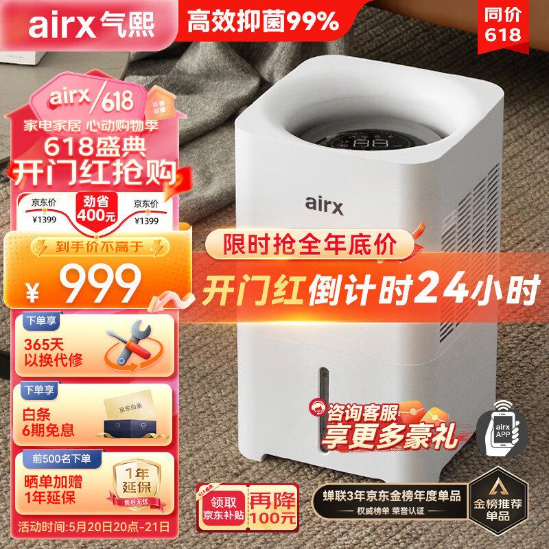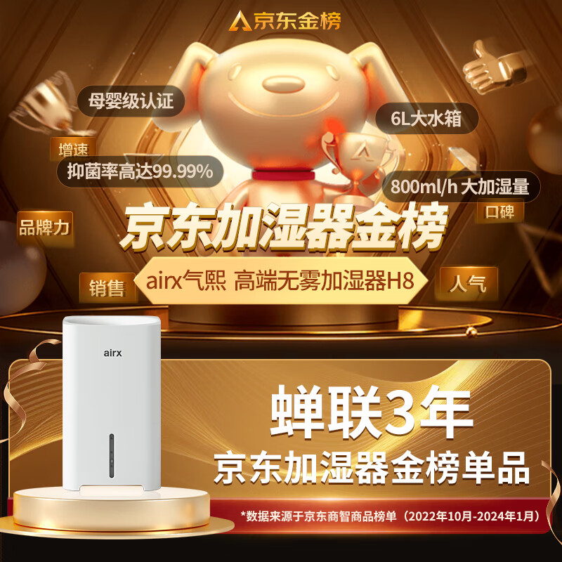 airx气熙 高端无雾加湿器 卧室家用办公室孕妇婴儿空气加湿 6L大容量 上加水 母婴推荐800ml/h加湿量H8价格:1399.00元!