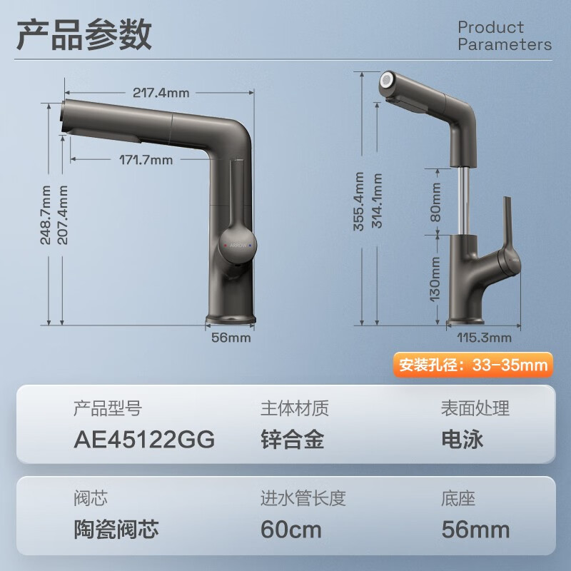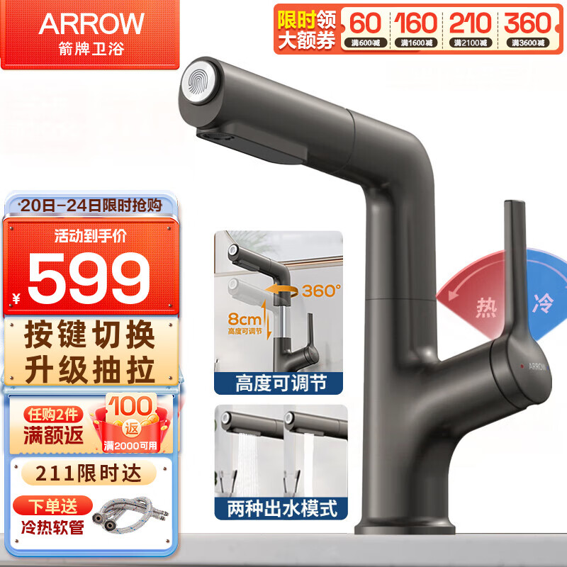 箭牌(ARROW) 厨卫面盆龙头多功能抽拉洗脸台上盆水龙头加高卫生间冷热水龙头 枪灰色 升降按键抽拉龙头价格:699.00元!