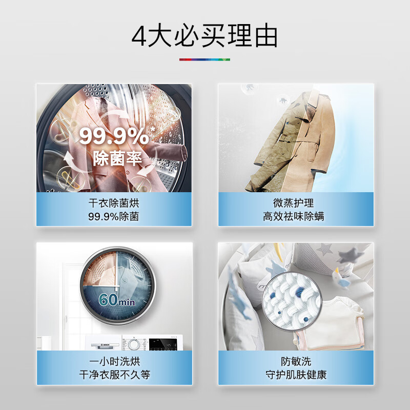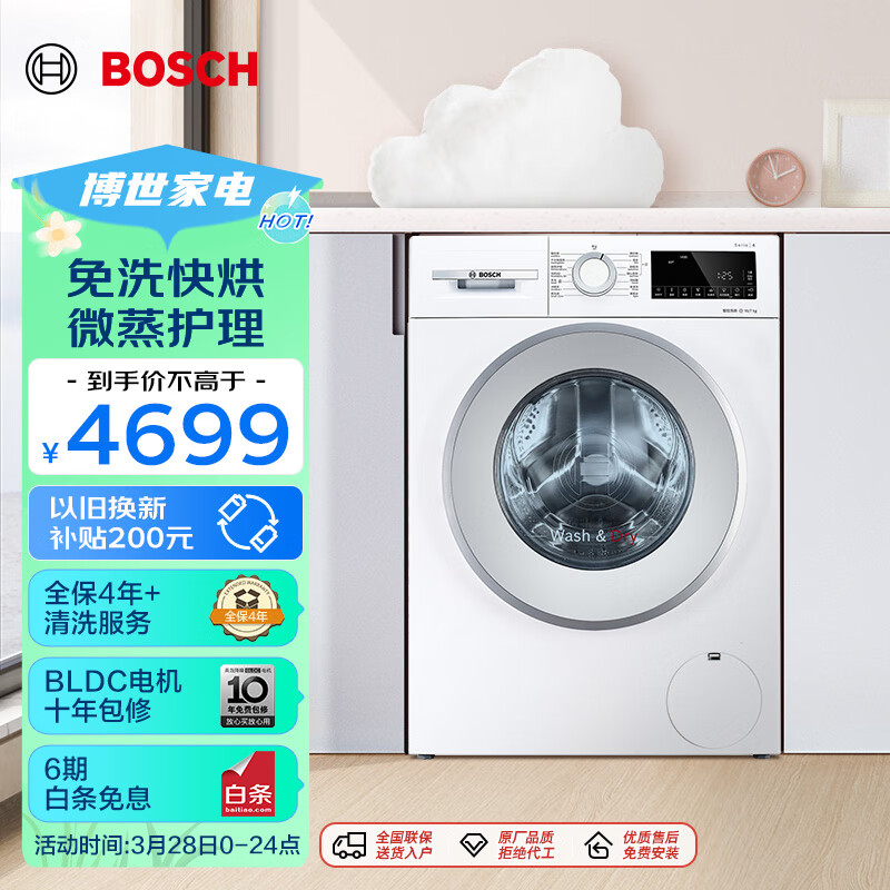 博世(BOSCH)【云朵白·经典版】10KG家用大容量全自动滚筒洗衣机洗烘一体机 微蒸护理 热风除菌WNA254VA0W价格:4699.00元!