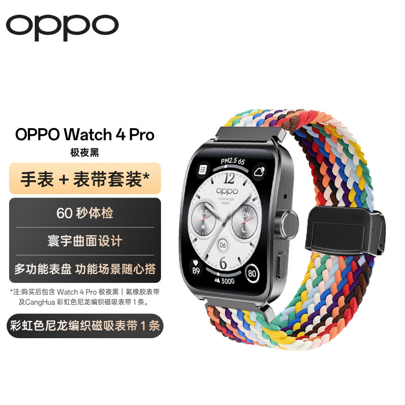 OPPO Watch 4 Pro 极夜黑 全智能手表 男女运动手表 智能健康eSIM电话手表+彩虹色尼龙编织表带套装价格:2342.00元!