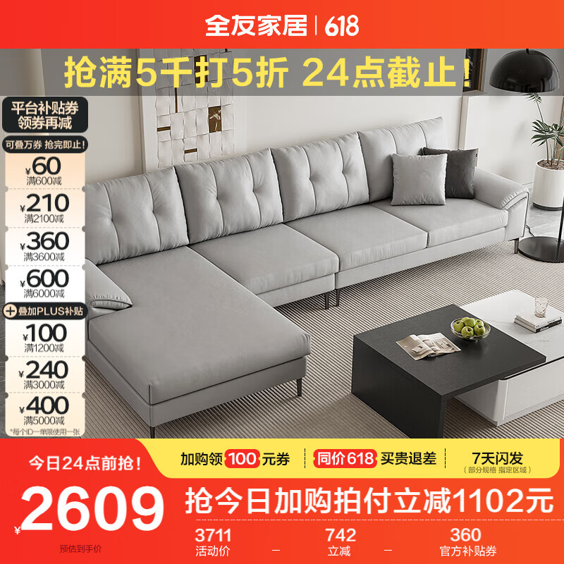 全友家居 科技布沙发客厅现代简约转角贵妃位布艺大户型沙发111037价格:3711.25元!
