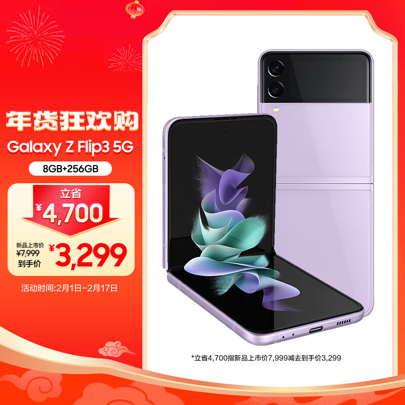 三星 SAMSUNG Galaxy Z Flip3 5G 折叠屏 双模5G手机 立式交互体验IPX8防水8GB+256GB紫 梦境极光价格:3299.00元!