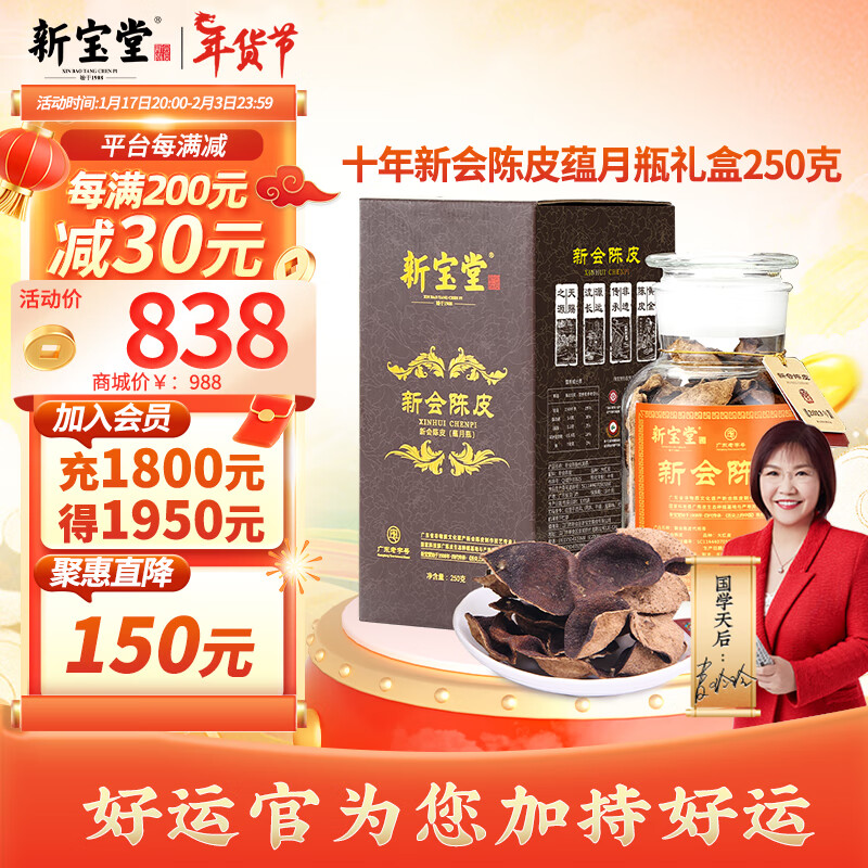 岭南新宝堂陈皮十年新会陈皮蕴月玻璃瓶10年陈皮养生茶年货礼盒250克价格:838.00元!