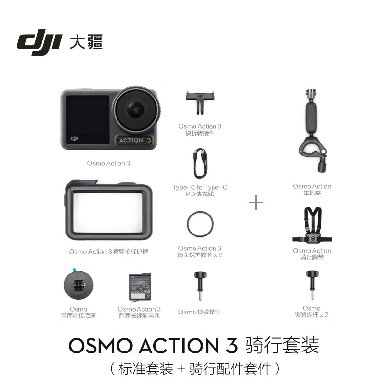 大疆 DJI Osmo Action 3 骑行套装 运动相机 户外骑行摩托车行车记录仪 小型防抖vlog相机+随心换2年版价格:2187.00元!