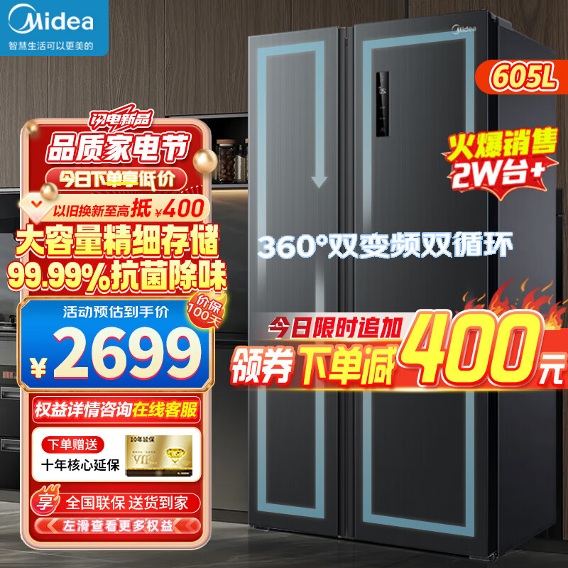 美的(Midea)605升双开门冰箱对开门一级双变频净味风冷无霜家用大容量大冷冻力【美的606姐妹款】价格:2699.00元!
