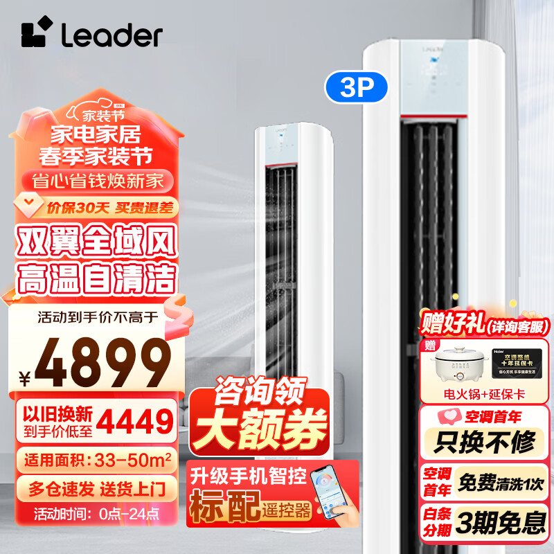Leader空调海尔出品大3匹立式空调 一级能效变频节能冷暖防直吹家用客厅柜机空调以旧换新LKB81TU1[家电]价格:4899.00元!