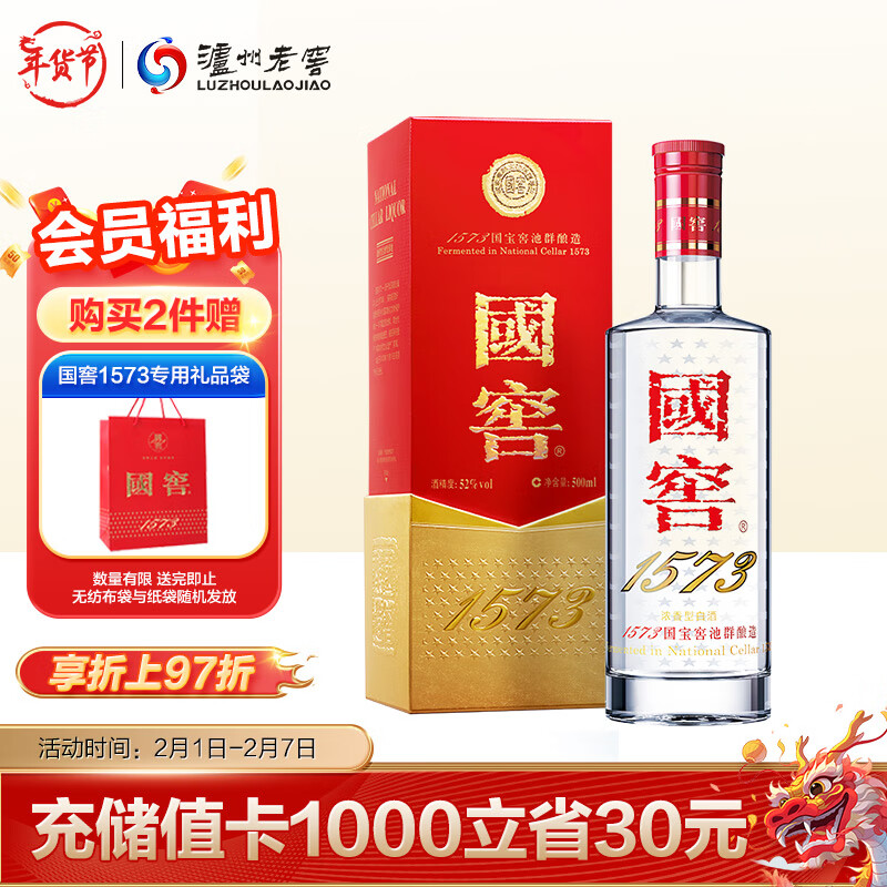 泸州老窖 国窖1573 浓香型 高度白酒 52度500ml单瓶 经典装 (自饮送礼)价格:970.00元!