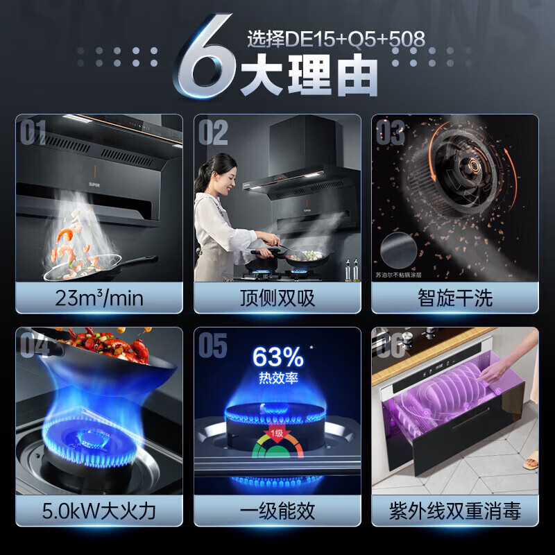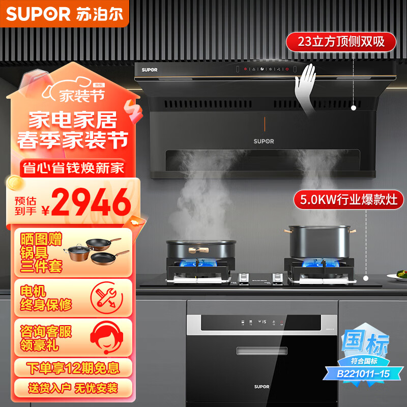 苏泊尔(SUPOR) 烟灶消顶侧双吸7字型大吸力 23立方免拆洗油烟机燃气灶消毒柜多件套 DE15+Q5天然气+508价格:2946.00元!