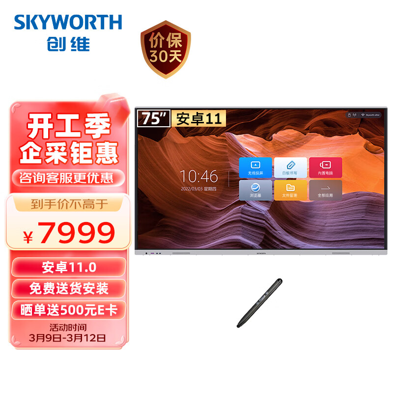 创维(Skyworth)75英寸会议平板 智能触摸一体机 电子白板书写 无线传屏投影 视频会议触屏电视75DSH5【商用显示】价格:7999.00元!