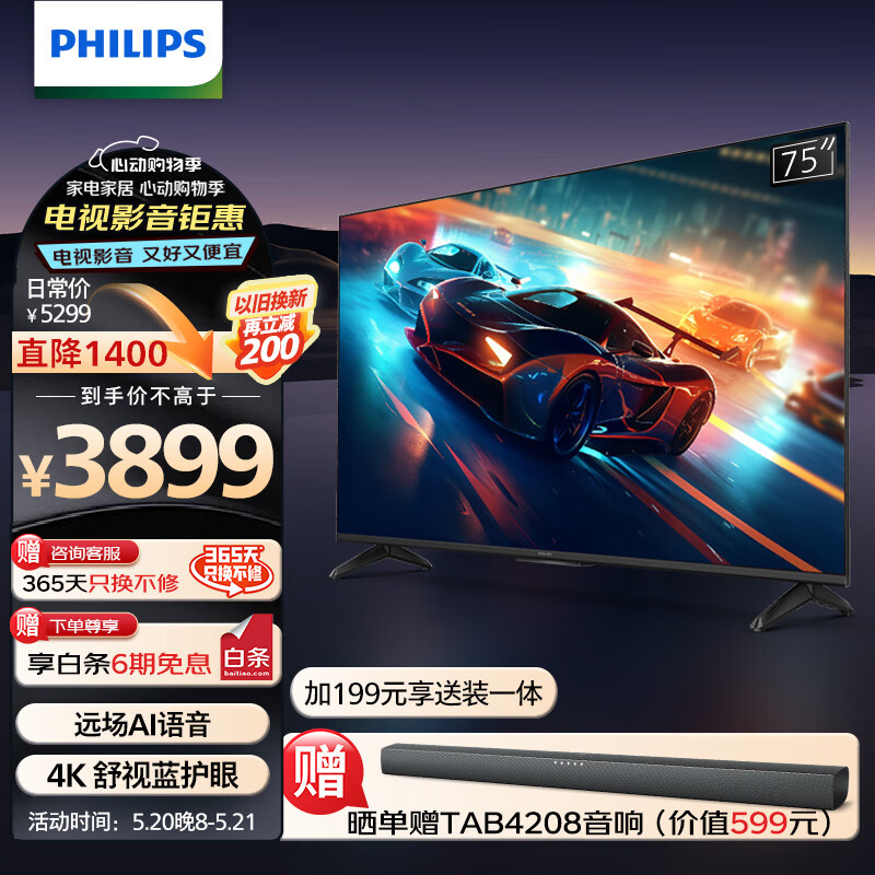 飞利浦(PHILIPS)75英寸4K超高清 护眼舒视蓝 MEMC智慧屏游戏电视 远场AI语音 智能液晶平板电视75PUF7808/T3价格:3899.00元!