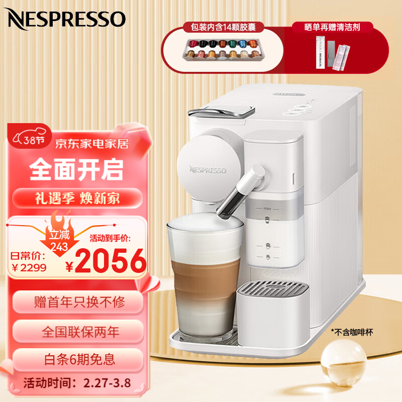 Nespresso胶囊咖啡机 Lattissima One意式进口全自动办公家用奶沫一体咖啡胶囊机 除垢提示一键牛奶配方F121价格:2299.00元!