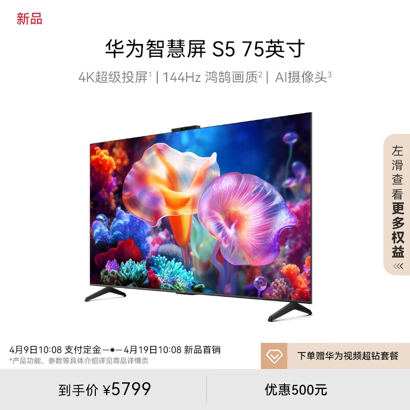 华为智慧屏 S5 75英寸 4K超级投屏 144Hz鸿鹄画质高清超薄智能液晶游戏电视机HDB5276H价格:5799.00元!