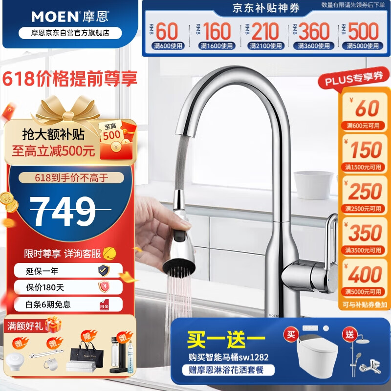 摩恩(MOEN)厨房水龙头 抽拉式洗菜盆洗碗盆水槽冷热水龙头 高抛净铅龙头价格:949.01元!