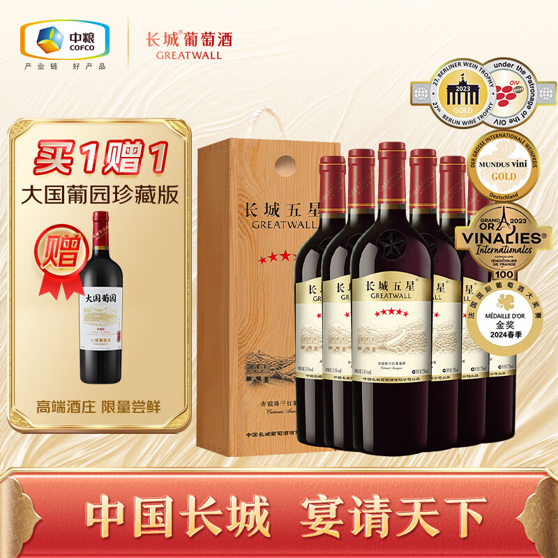 长城 五星赤霞珠 干红葡萄酒 750ml*6瓶 整箱装 木盒整箱价格:2360.00元!