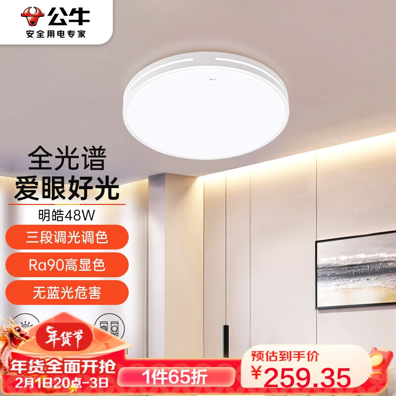 公牛(BULL)吸顶灯全光谱MX-B048E-CS明皓卧室灯北欧现代简约圆形三段调光48W价格:399.00元!