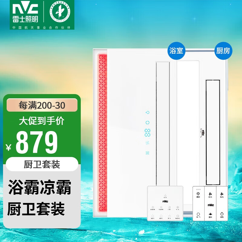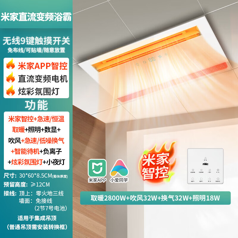 雷士(NVC)米家直流变频暖风机浴室取暖器照明换气一体风暖浴霸+凉霸套餐价格:1129.00元!