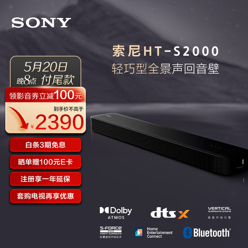 索尼(SONY)HT-S2000 3.1声道 轻巧型全景声回音壁 一键环绕 家庭影院 Soundbar 客厅卧室 电视音响 蓝牙价格:2490.00元!