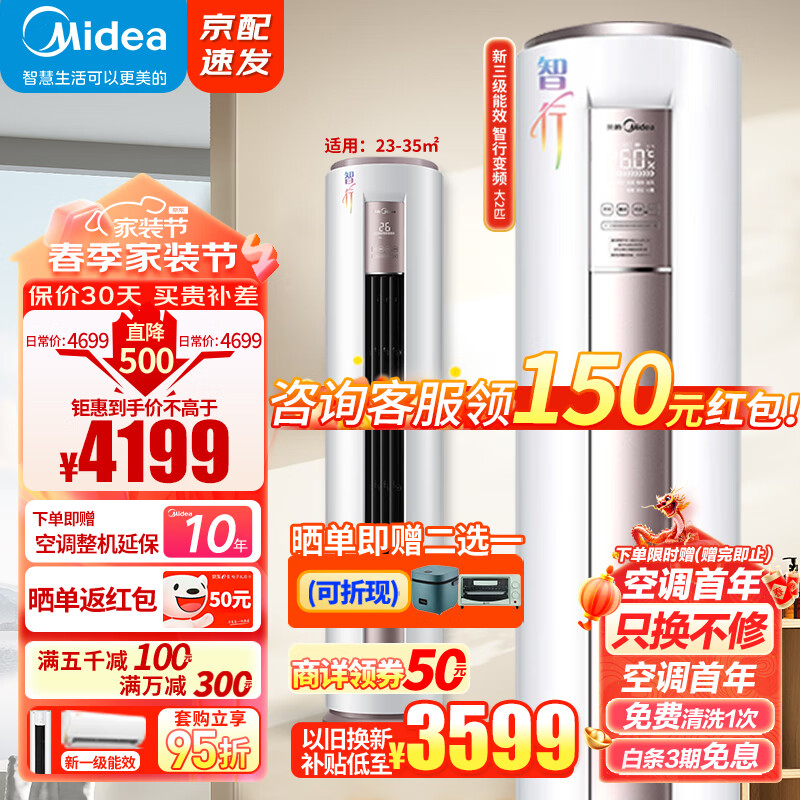 美的(Midea)空调2匹 柜机 新能效 变频冷暖 圆柱空调立柜式 客厅以旧换新 智行 [KFR-51LW/BDN8Y-YA400(3)A]价格:4199.00元!