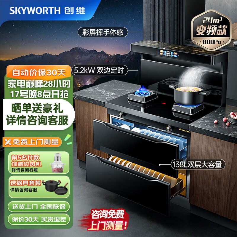 创维(Skyworth)集成灶一体灶 彩屏智能变频大吸力 家用环保灶定时燃气灶 AI语音声控 烟灶消套装J001B天然气价格:3780.00元!
