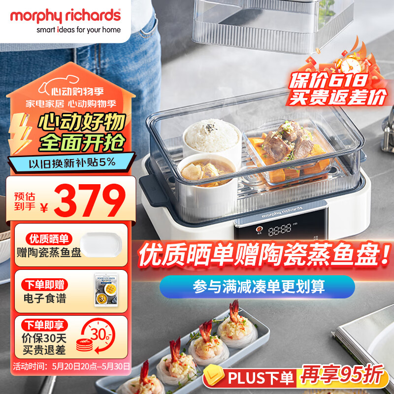 摩飞电器(Morphyrichards)蒸炖锅速蒸锅电蒸锅多功能锅家用12L大容量预约定时保温电炖锅隔水炖煮锅 MR1158 白色价格:429.00元!