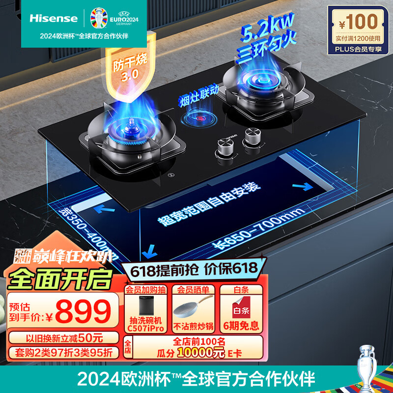 海信(Hisense)燃气灶天然气 嵌入式燃气灶台嵌两用5.2kW铜火盖烟灶联动防干烧底座可调节JZT-A1智享 以旧换新价格:899.00元!