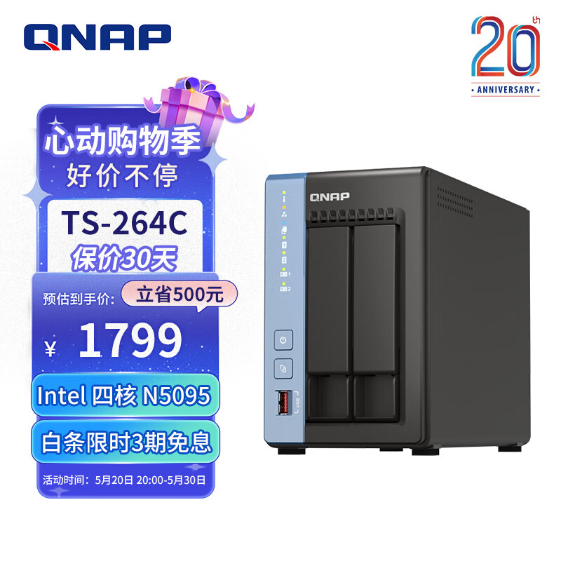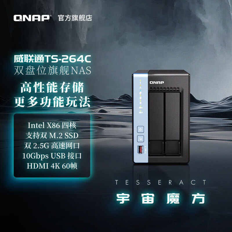 威联通(QNAP)TS-264C 魔方 8G内存2盘位四核心处理器网络存储服务器内置双 M.2 插槽NAS私有云价格:2299.00元!